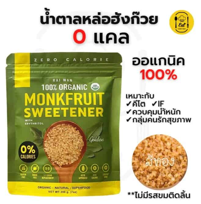 น้ำตาลหล่อฮั่งก๊วยเสริมน้ำตาลอิริทริทอล สีทอง 0 แคล ขนาด 200 กรัม ตรา RAIWAN