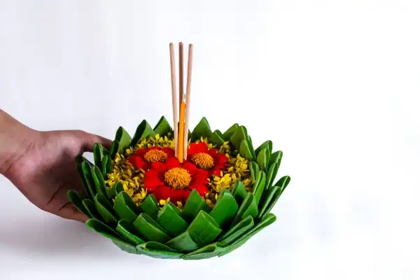 การวางเทียนและธูปในตำแหน่งที่เหมาะสมจะช่วยให้กระทงลอยได้ตรงและไม่เอียง แนะนำให้ปักเทียนตรงกลางของฐาน ส่วนธูปให้เบี่ยงเล็กน้อยไปด้านหลัง แล้วจัดดอกไม้ให้มีสัดส่วนซ้าย–ขวาเท่ากัน จะช่วยให้กระทงลอยนิ่งได้มากขึ้นแม้ในน้ำที่มีแรงกระแทกเป็นคลื่นน้ำได้ค่ะ